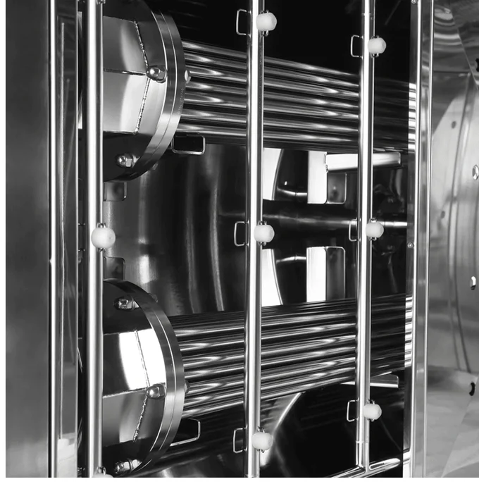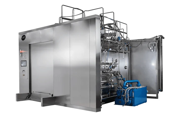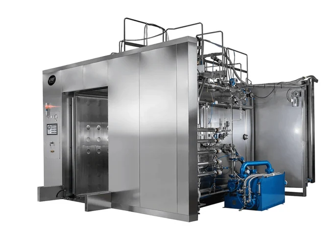 Терминальные стерилизаторы cGMP Эти стерилизаторы оснащены системой рециркуляции воды с высоким расходом, состоящей из центробежных насосов и теплообменников типа «двухтрубный теплообменник». В этой системе используется вода (вода для инъекций или проточная вода) в качестве теплоносителя для нагрева, стерилизации и охлаждения загрузки. Она гарантирует оптимальное распределение тепла на протяжении всего процесса стерилизации с отклонением температуры менее ±1°C. Этот метод позволяет ускорить циклы, хотя обрабатываемый продукт остается влажным. Тем не менее, его часто выбирают за простоту, экономичность и легкость валидации.